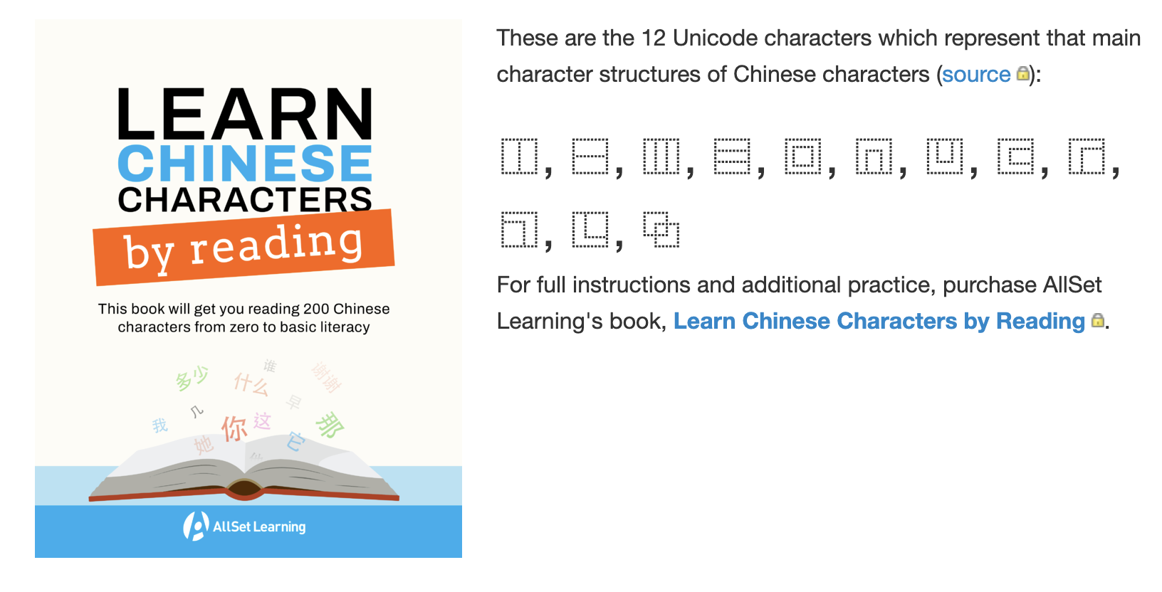 - Learn Chinese Characters by Reading (a book). This one evolved out of the idea of stripping down learning to read characters to the very basics: recognizing individual characters as part of simple sentences. It emerged organically out of my decade of work with AllSet Learning clients and also benefited from my work with graded readers at Mandarin Companion. What if you spent only the minimum amount of time learning about character etymologies, semantic components, etc. and focused more on just reading? Well, this book is the result! It can be done. And if you want to see the core 200 characters you learn in the book, you can do so online for free.